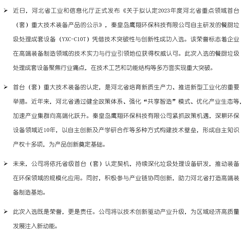 祝賀秦皇島鷹翔環(huán)??萍加邢薰井a(chǎn)品入選2023年度河北省重點領(lǐng)域首臺(套)重大技術(shù)裝備產(chǎn)品?